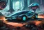 A friendly car playing with technology equipe, in a futuristic fantasy landscape that seamlessly blends organic and technological elements, futuristic lights, hard shadows, dark, fantasy, comic art
