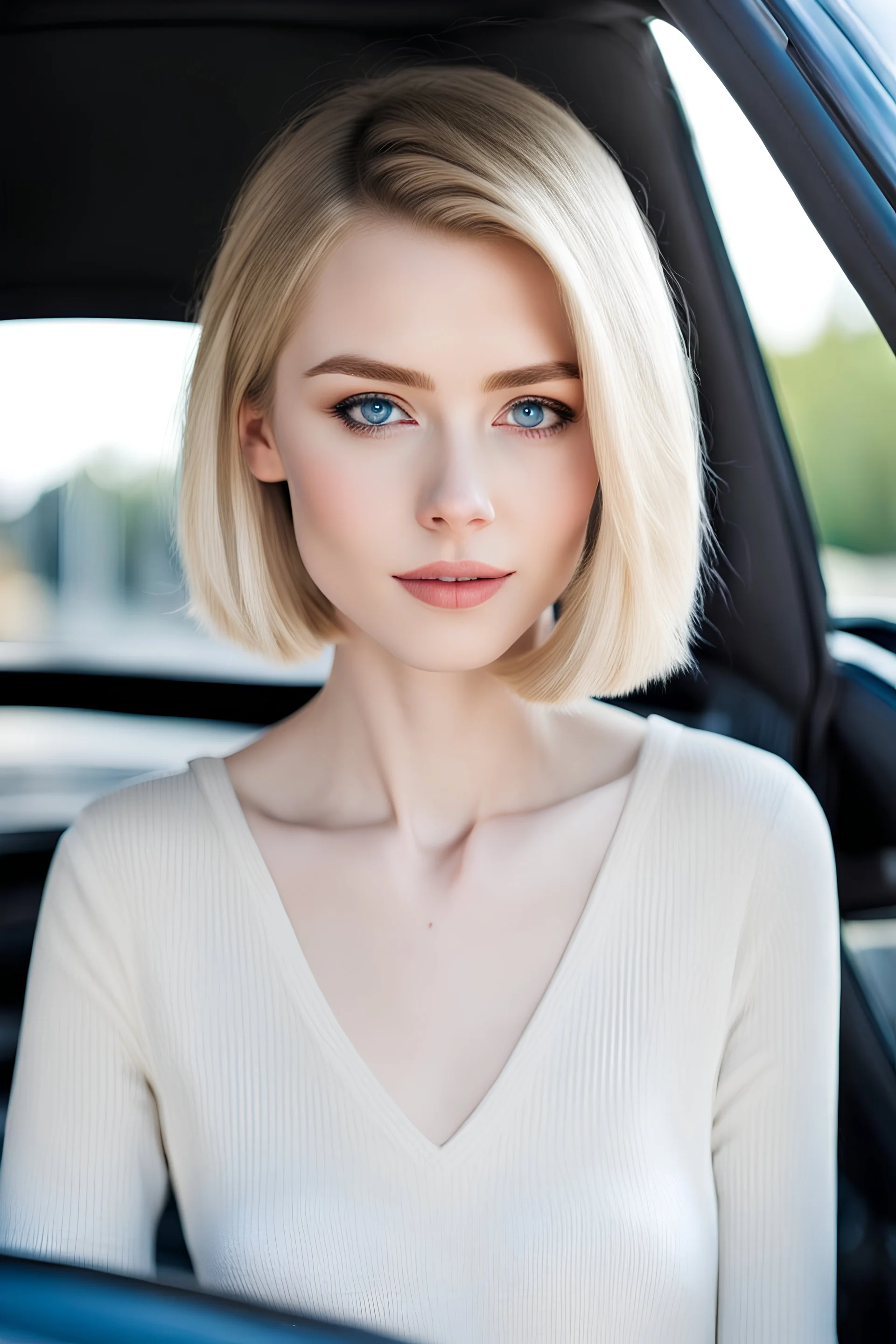 Beautiful woman, french, 22 years old, (pale:1.5) skin, light-blue eyes, blond (straight:1.5) short hair, slim, lady, without makeup, inside a car