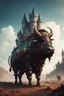 a large animal that is standing in the dirt, by Artur Tarnowski, fantasy art, very far royal steampunk castle, buffalo, style hybrid mix of beeple,