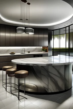 Kitchen, modern style, light timber veneer, metal Fram with tinted glass door, island bench, marble bench top