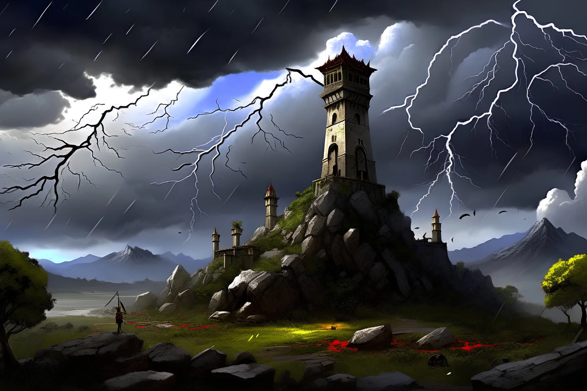 Digital art, high quality, masterpiece, natural illumination, contrast, grey sky, thunder, lightnings, (tall inca towers:1.5), (inca ruins:1.2), dead trees, helicopter at the right