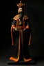 、头戴黑色中国皇冠、身着黑色龙袍和纁色裙子、高耸头饰、腰间佩戴古代宝剑、高鼻梁,鼻翼挺拔、眉目细长,大眼睛)、身材魁梧、长八尺六寸、威严凛然、神情冷酷、长胡须、四十岁几岁古代皇帝