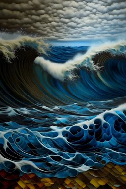 large tsunami wave in the illustrated painting style of alex grey with colors in blue, white, and grey