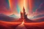 A surreal landscape where an old medieval tower radiates with orange and red hues, iridescent and rainbow effects fusing CosmicLumina and SkyDancer, ethereal ambiance