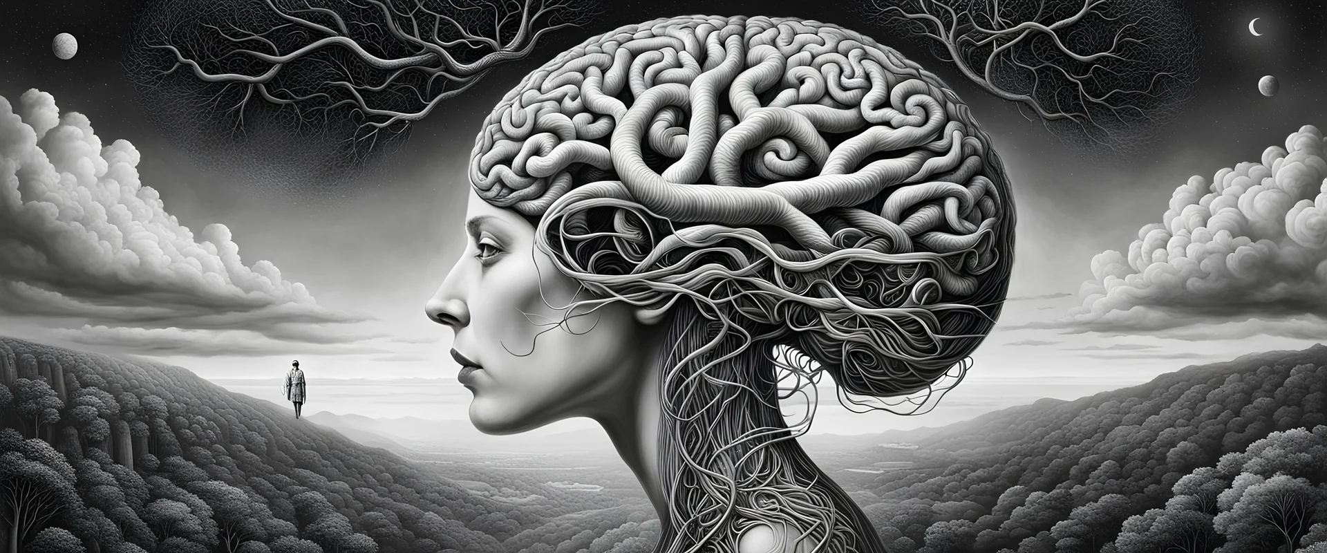 Brain makes the mind, mind makes the person. Concept art, Surrealism, overexaggerated features, beautiful, detailed, landscape, vibrant, whimsical, ethereal, Tim burton, entangled, infinity, cosmic, colorful,hyperrealism, renaissance painting, , metaphysical, laurie lipton, anthropomorphic character