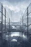 View from the bridge, three high-rise buildings, roofs of high-rise buildings in the clouds, small buildings around, fog, cloudy, gray tones, rain, railway under the bridge, rear view of a girl, black raincoat, red hair, long hair, bare legs, white socks