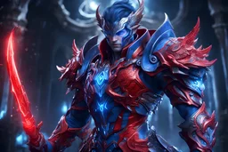 Aion in a mega cool iron super blue + Red suit with on his arms and shoulders, hdr, (intricate details, hyperdetailed:1.16), piercing look, cinematic, intense, cinematic composition, cinematic lighting, color grading, focused, (dark background:1.1)