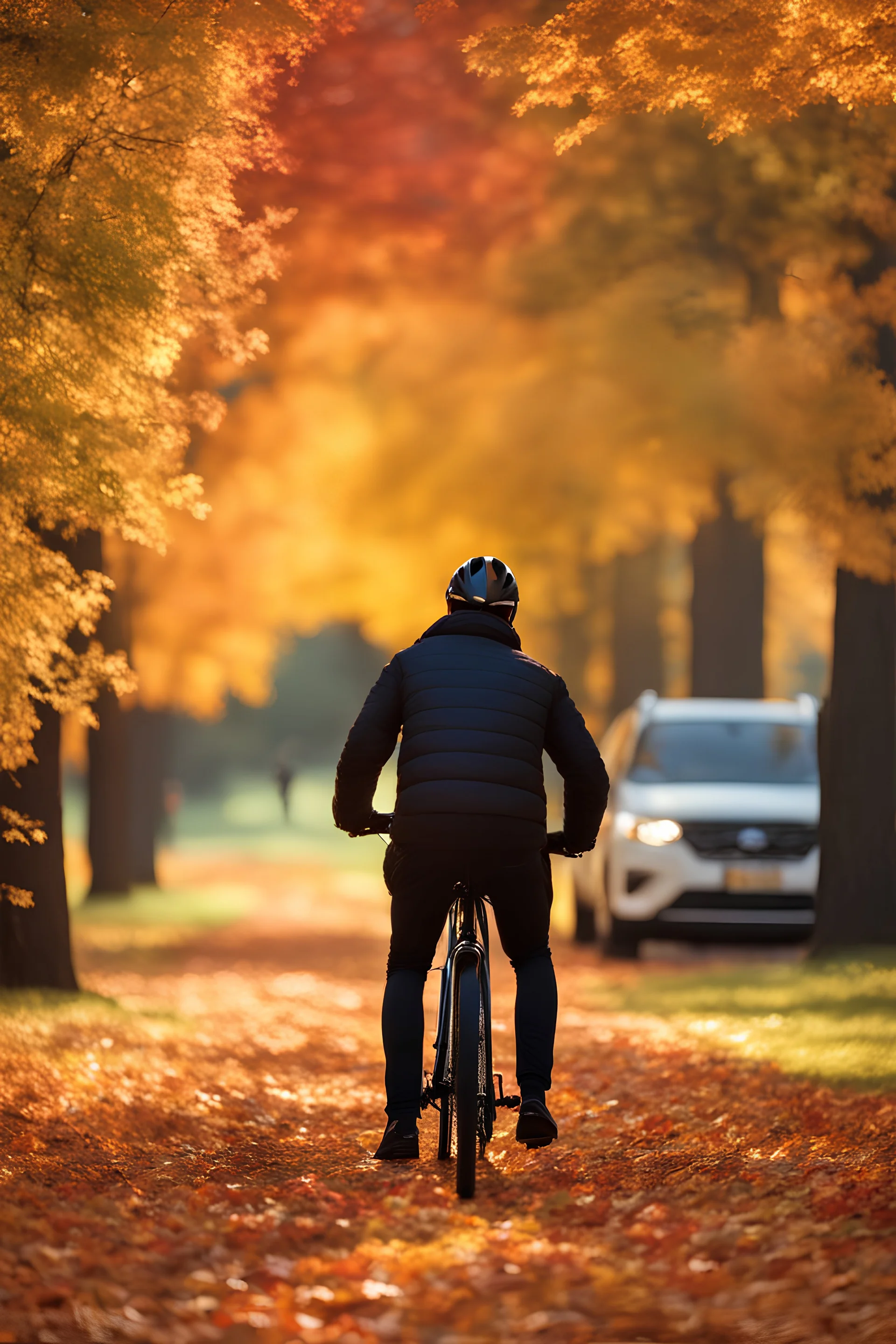 An Autumn Scene With A Man On A Bike, Stopped On The Side Of A Path, Wearing A Coat, Stopped To Take In The View, On The Grass, Colorful Leaves On The Ground, Vibrant, Colorful, Super Dramatic Light, Sharp Focus, Detailed, HDR, 8k Resolution