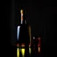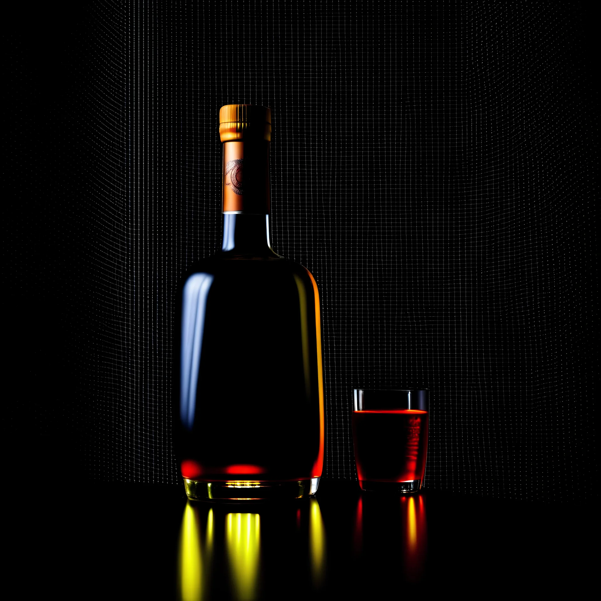 Acoustic guitar next to a glass of liquor in a dark space