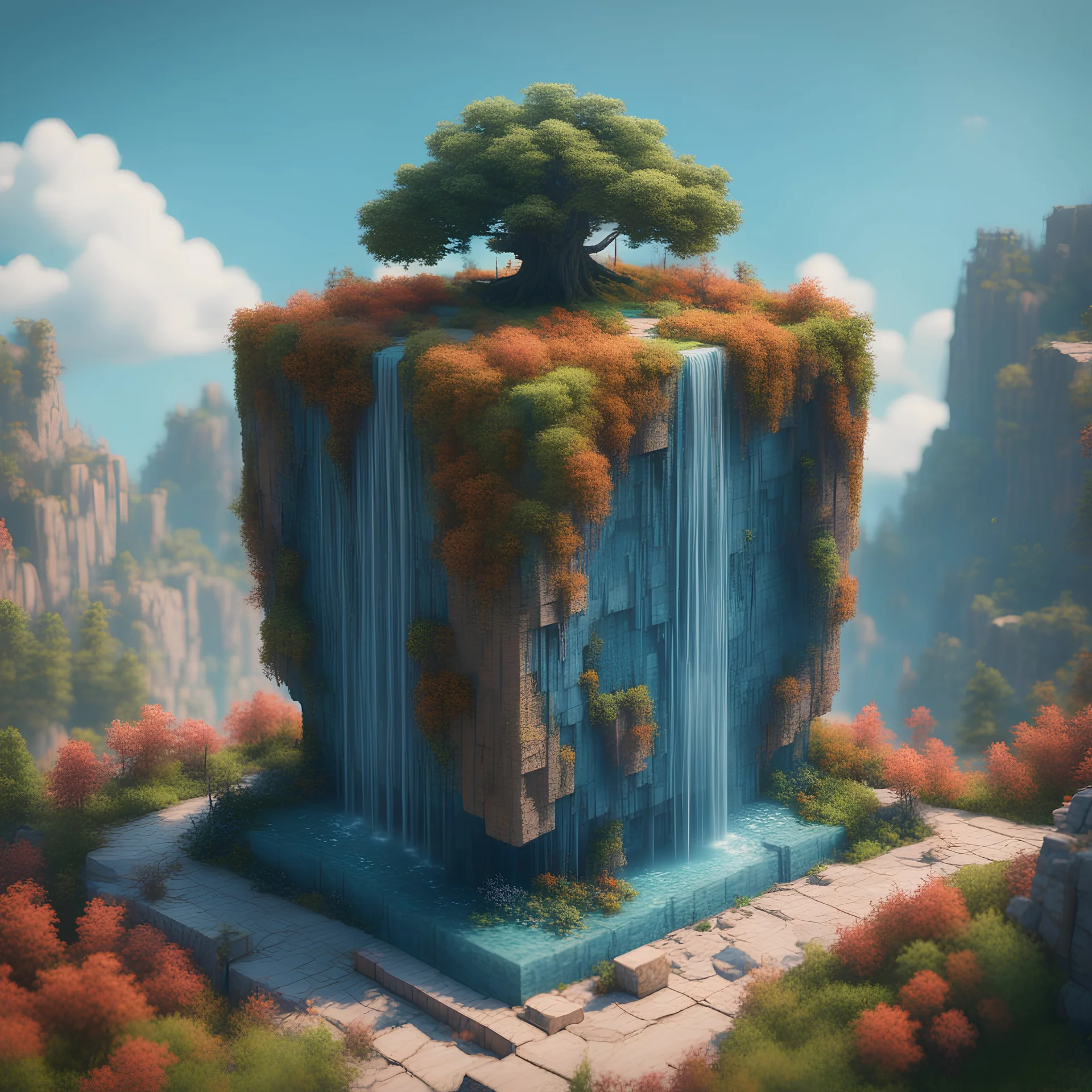 a cube of heaven, high quality, retro pixel art, shades of sky blue and earthy natural colors, octane render, sci fi - medieval, peaceful, anti-aliasing, 4k render, top side angle, add flowers, trees, waterfalls, miniatured