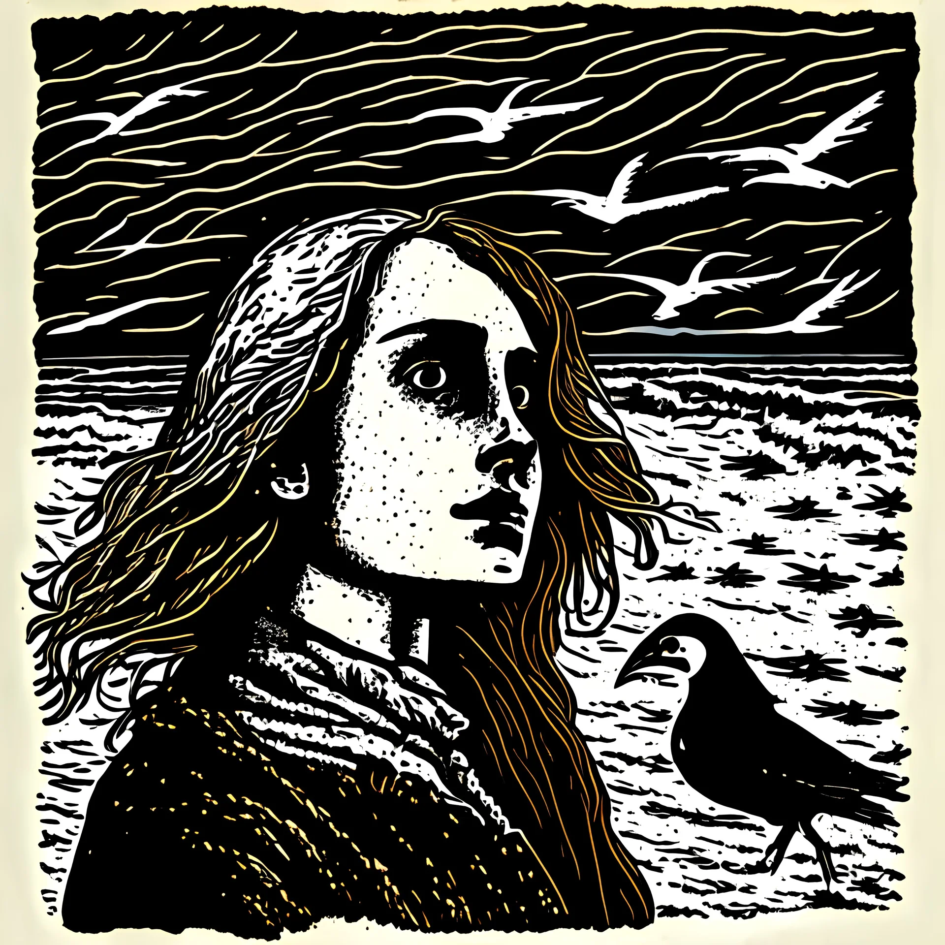A portrait of a young woman on the beach in dark sea weather and a seagull over it as a linocut