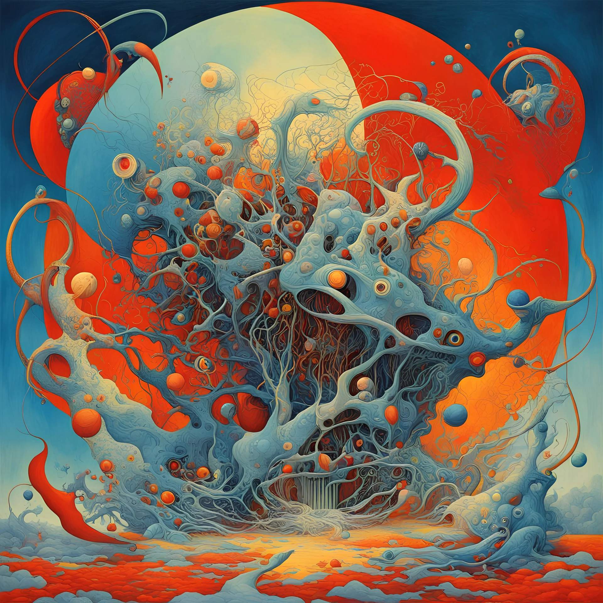 rolling like mad marbles, Bauhaus slide show shooting code, Alex Janvier and Zdzislaw Beksinski deliver a sinister surreal masterpiece, icy hues, warm colors, sinister, creepy, expansive, dark shines, asymmetric, Bauhaus style,